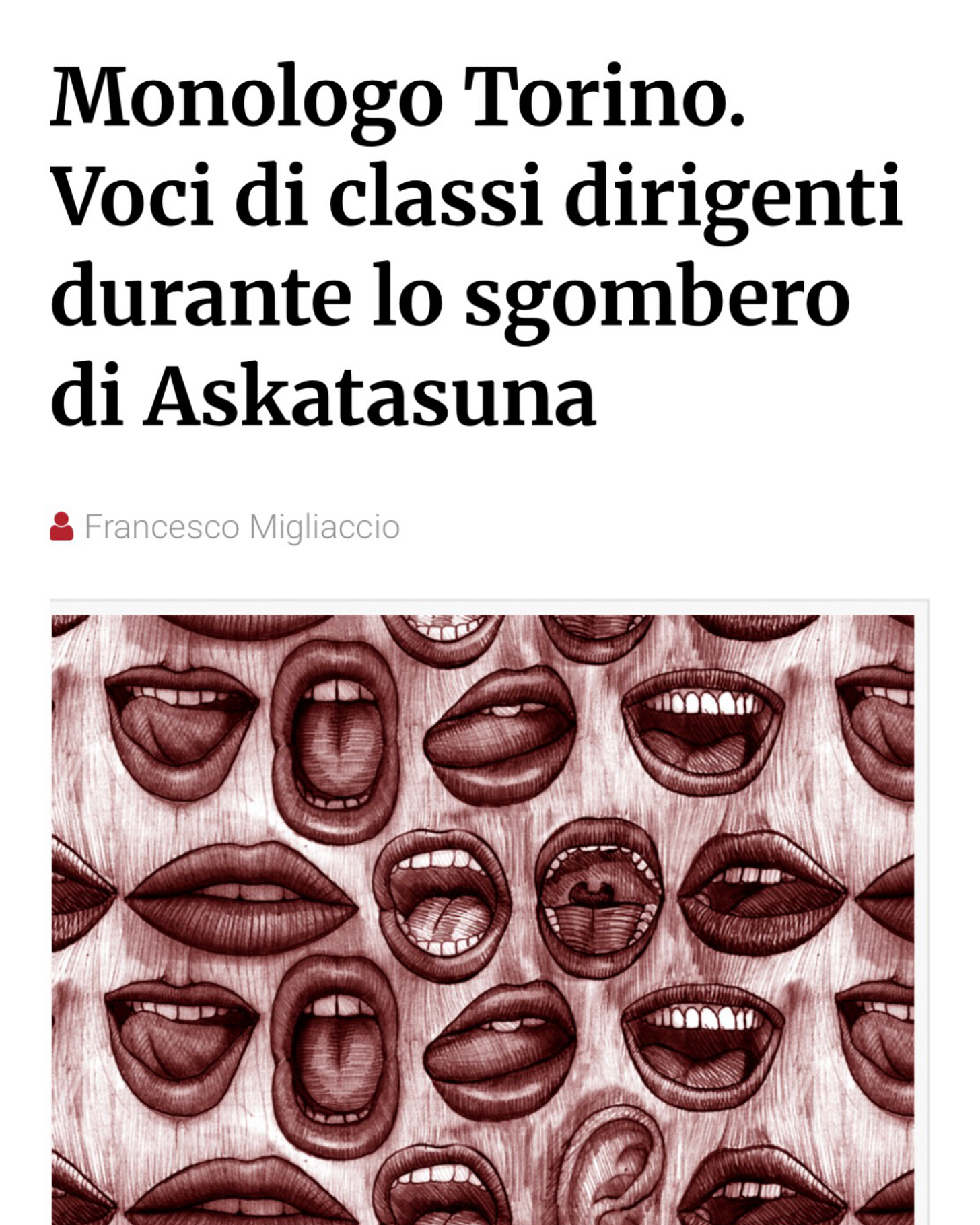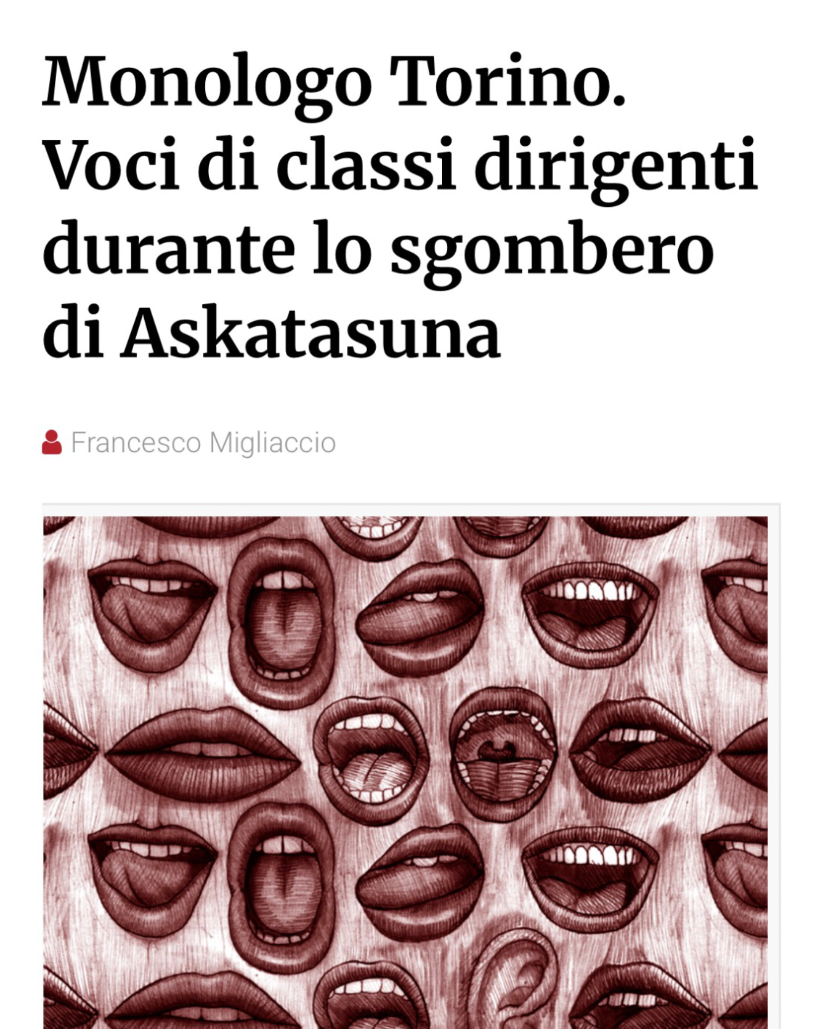 Mentre Askatasuna viene sgomberata all’alba con idranti, camionette e non solo un quartiere blindato ma una enorme parte della città La Stampa organizza un incontro pubblico e sul palco salgono politici, dirigenti di fondazioni bancarie, manager di aziende partecipate, imprenditori culturali. Tutti parlano di democrazia, dialogo, futuro, cultura, rinascita della città. Perché loro hanno già deciso per noi, senza consultarsi con i cittadini e le cittadine che quella città la vivono e la viviamo. Noi siamo decisamente di più come numero di una line-up di una vetrina borghese, la città è nostra e non loro.