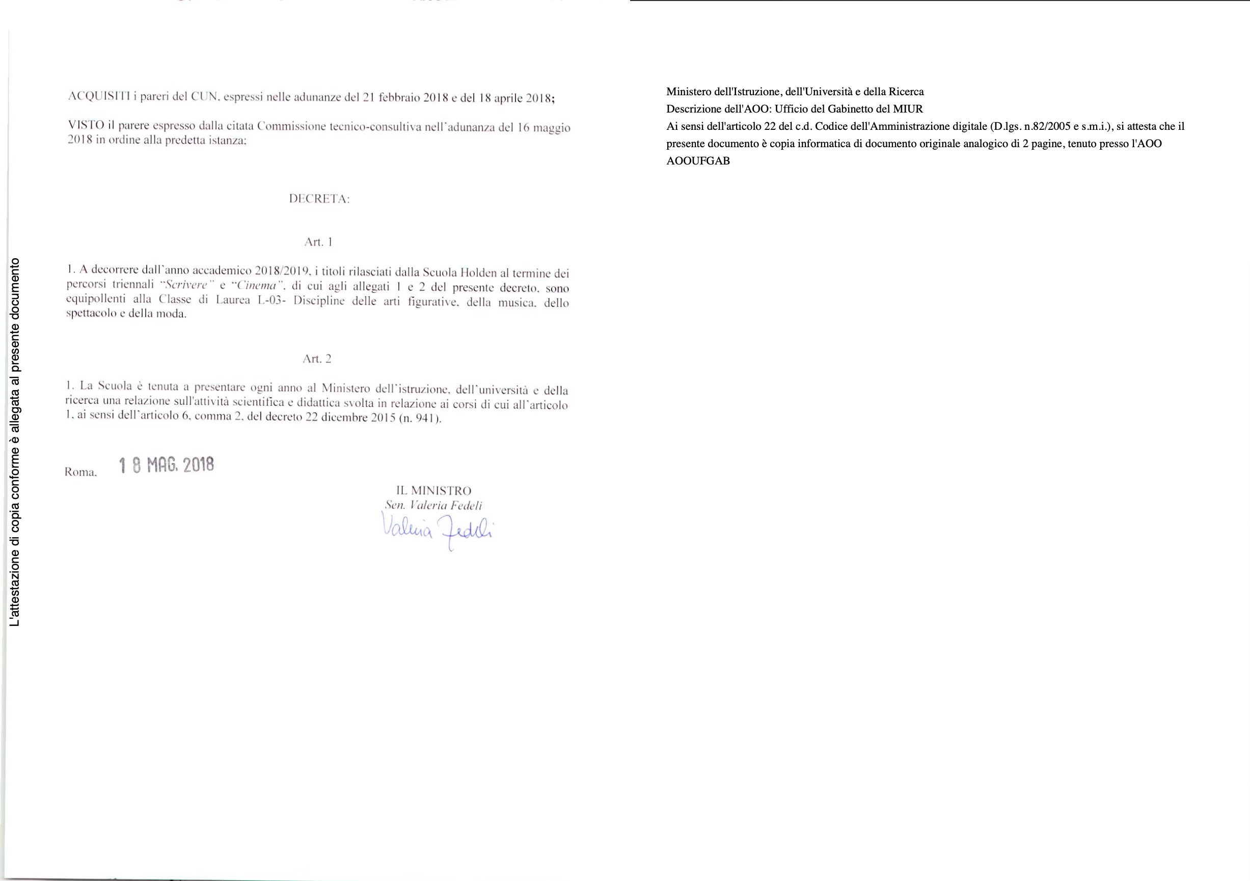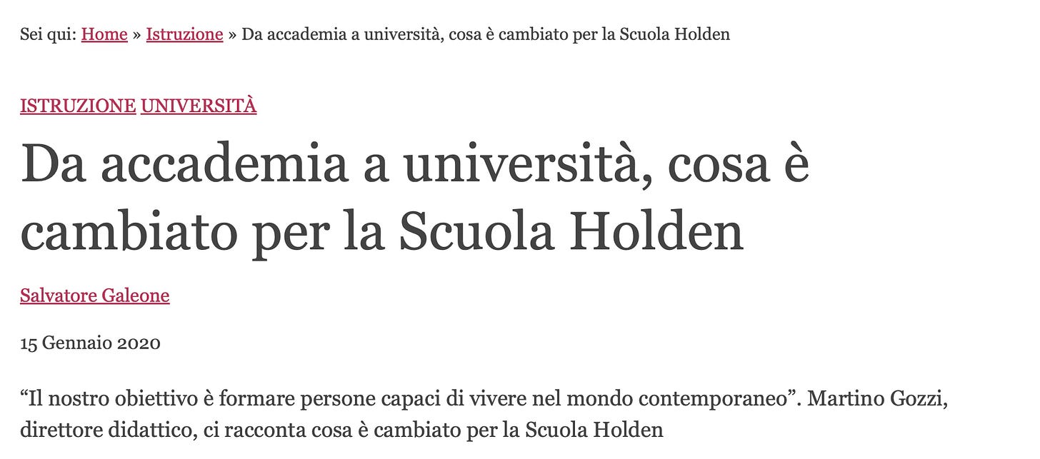 Il DM 408 del 18 maggio 2018 riconosce ai trienni “Scrivere” e “Cinema” (COSA LA HOLDEN HA DUE TRIENNI? Eh…pare così) della Scuola Holden l’equipollenza alla laurea L-03 (Arti figurative, della musica, dello spettacolo e della moda). Tuttavia, la Holden non è inserita né tra gli atenei accreditati né nel sistema AFAM, e nei diplomi che ho visionato la firma è solo di due figure interne: Alessandro Baricco (presidente e fondatore) e Annalisa Ambrosio (direttrice studenti). In altre parole, il titolo viene materialmente rilasciato dalla Scuola Holden Srl, cioè da una società privata. Questo lo dico perché stando alla mia ricerca delle fonti pubbliche, questa cosa non si trova (questa è la ricerca per il 2018)