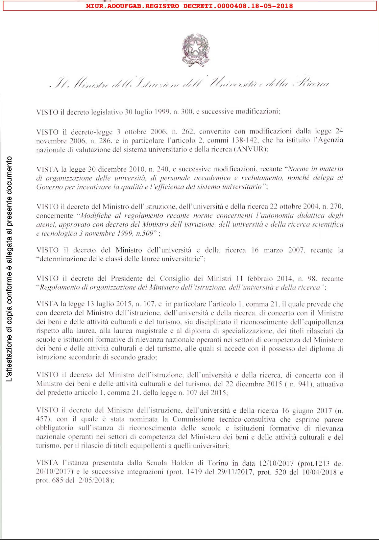 Il DM 408/2018, che ho pubblicato integralmente, non è reperibile negli elenchi ufficiali del MIM: mi è stato fornito in privato, ma non tengo gli allegati che cita e non li trovo online. Questo lo distingue nettamente dai casi di Brera, RUFA o Accademia Albertina, dove la firma del diploma è dell’istituzione AFAM riconosciuta e registrata, e l’iter è visibile e tracciabile.