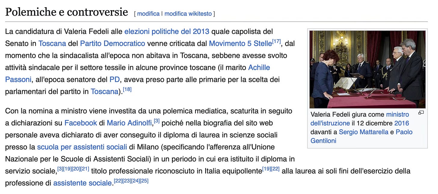 Trovo divertente che il Decreto Ministeriale 408 del 18 maggio 2018 della Scuola Holden è firmato da Valeria Fedeli, che in quel momento era Ministra dell’Istruzione, dell’Università e della Ricerca nel governo Gentiloni (partito democratico) e trovo molto triste che una persona vischiosa come Adinolfi abbia fatto emergere ciò:
