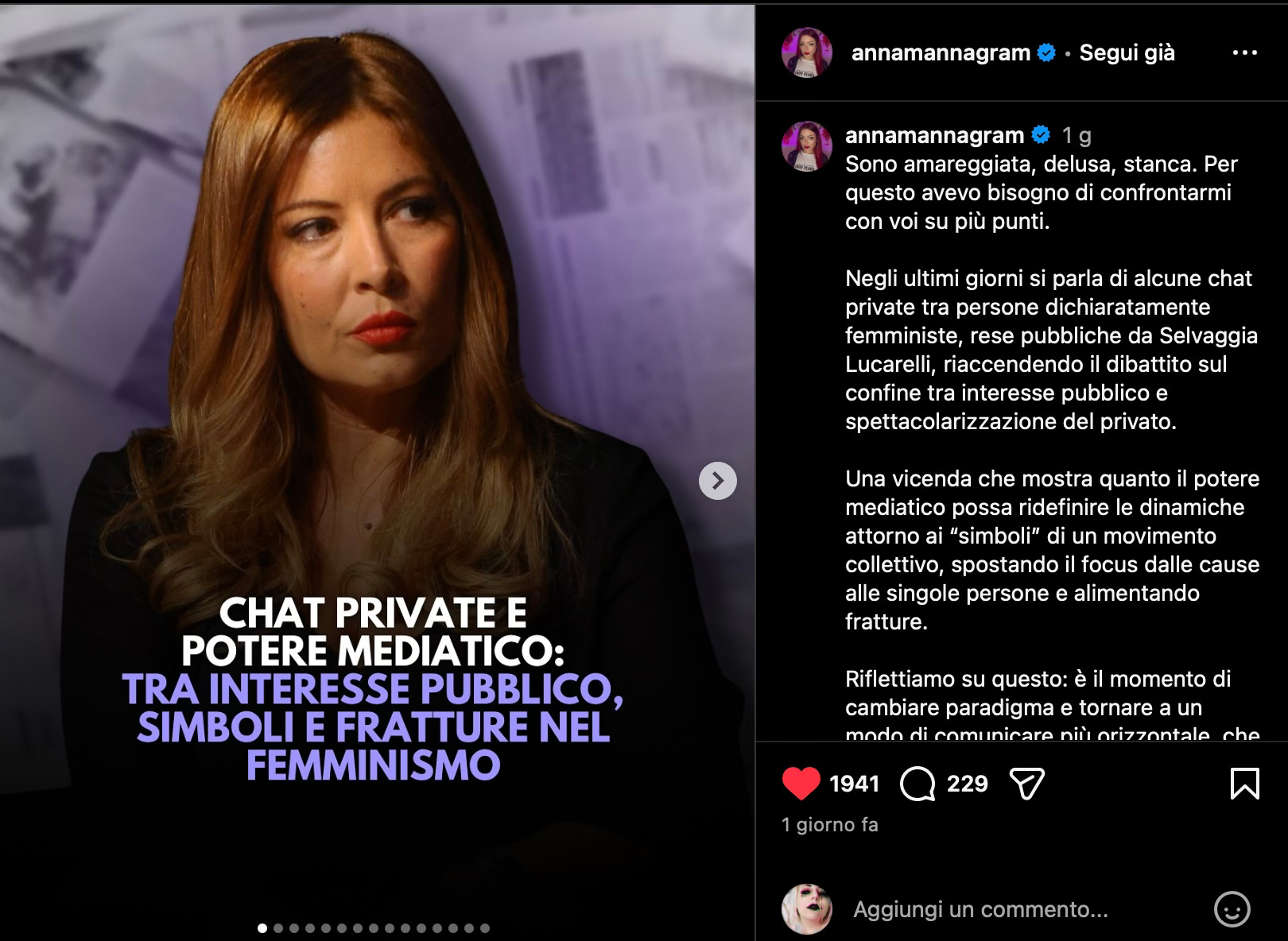 Quando denunciamo un fatto, stiamo raccontando una sequenza di eventi supportata da materiale che li testimonia. L’avvocato redige una lettera con l’ipotesi di reato e chiede al P.M. di indagare. Da lì partono le indagini. Se durante l’indagine l’ipotesi non trova riscontro, il procedimento viene archiviato. Se invece viene confermata, allora si passa alla fase successiva, quella processuale. I fascicoli delle indagini sono pubblici. Il primo a parlarne è stato Domani, prima ancora di Selvaggia Lucarelli – pensa un po’. Quindi no, non stiamo parlando di gossip o di fughe di notizie misteriose: si tratta di documenti accessibili, che chiunque può consultare (con una motivazione, certo, ma non sono secretati). È ovvio che chiunque abbia più chat di gruppo, anche con le stesse persone – amiche intime o meno. Ma il punto è che in alcune di quelle conversazioni non solo emergono elementi che confermano le ipotesi di reato, ma anche dinamiche di potere e condotte vessatorie interne a una parte del mondo progressista. Tutto qui.