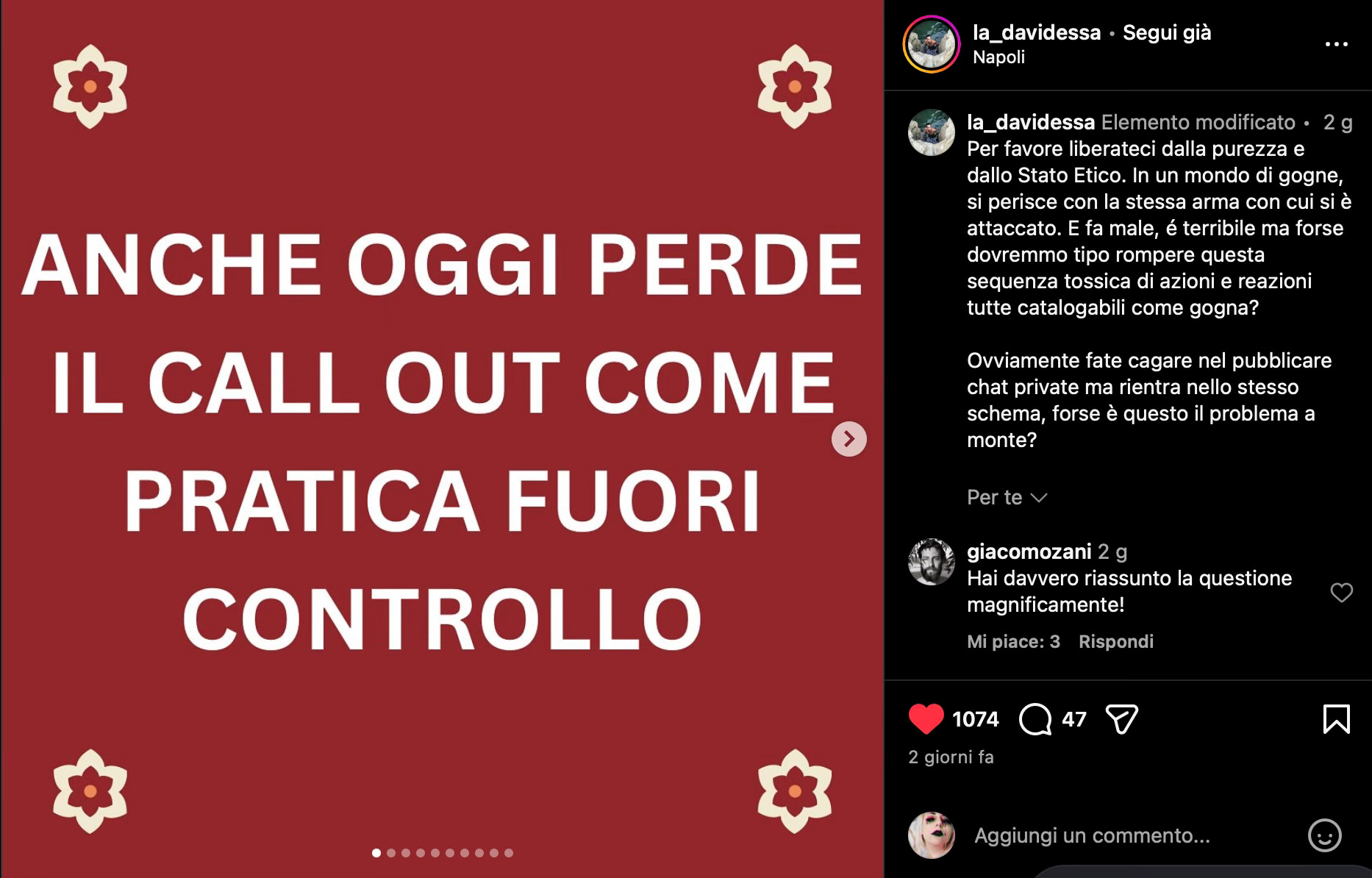 Come ho già detto: il privato diventa pubblico quando serve a mostrare una dinamica di potere. Io mi sono limitata ad analizzarla, come faccio sempre nei miei spazi. Non ho nominato nessuno al di fuori delle tre persone effettivamente indagate.