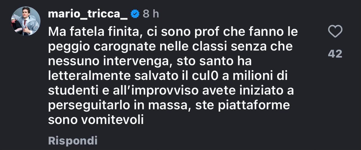 Questo è un commento di Mario Tricca, un ragazzo che ha partecipato alla 4a edizione del programma, sotto il post di Selvaggia Lucarelli su Instagram mentre parla di Vincenzo Schettini.