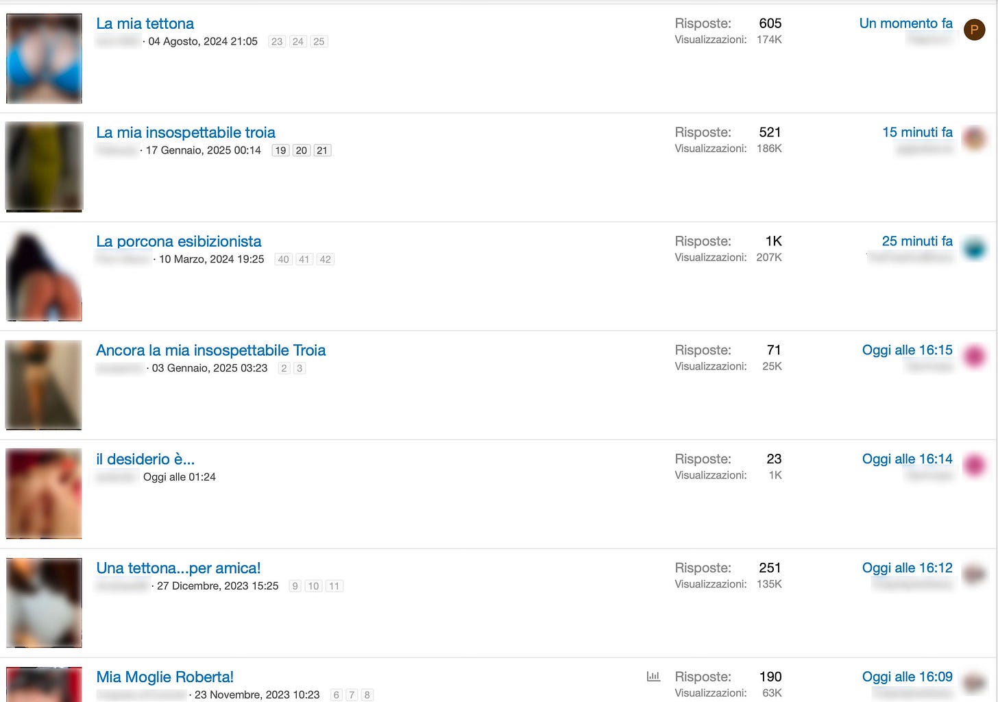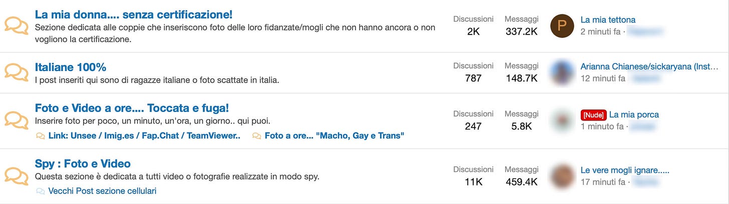 In pratica puoi leggere “spio mia sorella”, “telecamera in bagno”, ma non puoi entrare nel dettaglio. Serve partecipare, pubblicare, interagire. È un sistema a premi che tutela chi produce violenza e la maschera dietro un accesso “esclusivo”. Un sito che vive della violazione del consenso, ma protegge il proprio, come fosse una valuta.
